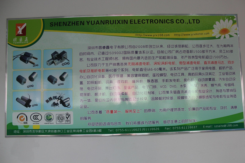 深圳市圓睿鑫電子有限公司自2008年創(chuàng)立以來,經(jīng)過誠信耕耘,在為期兩年的時間內(nèi),已通過ISO9001:2000國際質(zhì)量體系認證。公司廠房占地面積2000多平方米,員工100人,專業(yè)技術(shù)工程師6名,擁有國內(nèi)最先進的生產(chǎn)和檢測設(shè)備,年產(chǎn)各類減速電機超過2~300萬臺。因公司發(fā)展需要,于2020年底,將生產(chǎn)基地遷往擁有最美小鎮(zhèn)之稱的東莞市清溪鎮(zhèn),依山傍水,依托美麗的大自然環(huán)境和地方文化,全新的東莞市圓睿鑫電子有限公司將借助深圳母公司平臺,一步步走上新的臺階。